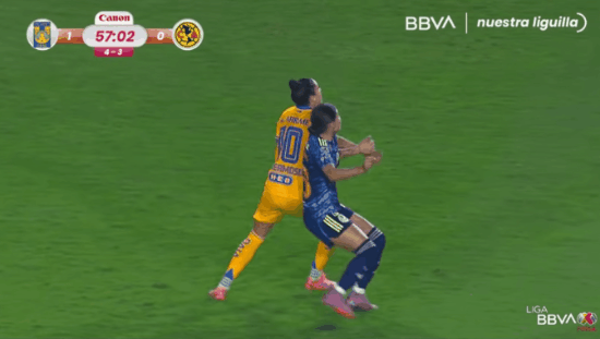 18’ On the ensuing goal kick from the above free kick, Tigres played short, and America immediately pressed from multiple angles, rushing the Tigres defenders and creating a turnover that resulted in a shot saved by Ceci Santiago. But the play was recommended for review by VAR, and Greta Espinoza was found guilty of a handball in the box, resulting in a penalty for America that was hammered home by Irene Guerrero to give Club America a 1-0 lead.