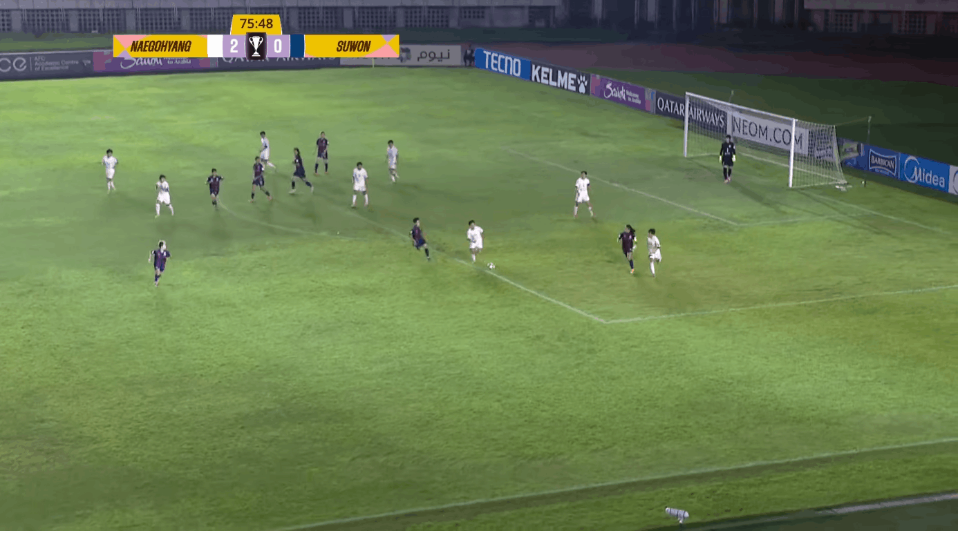 The match between the two Korean sides opened with a battle for the midfield. Naegohyang were having the better of the action, but neither team created much danger, and the first shot didn’t come until the 16th minute. On the whole, the first half was relatively quiet, through Naegohyang did hit the post and force a good save from Jeon Ha-Neul in Suwon’s net.