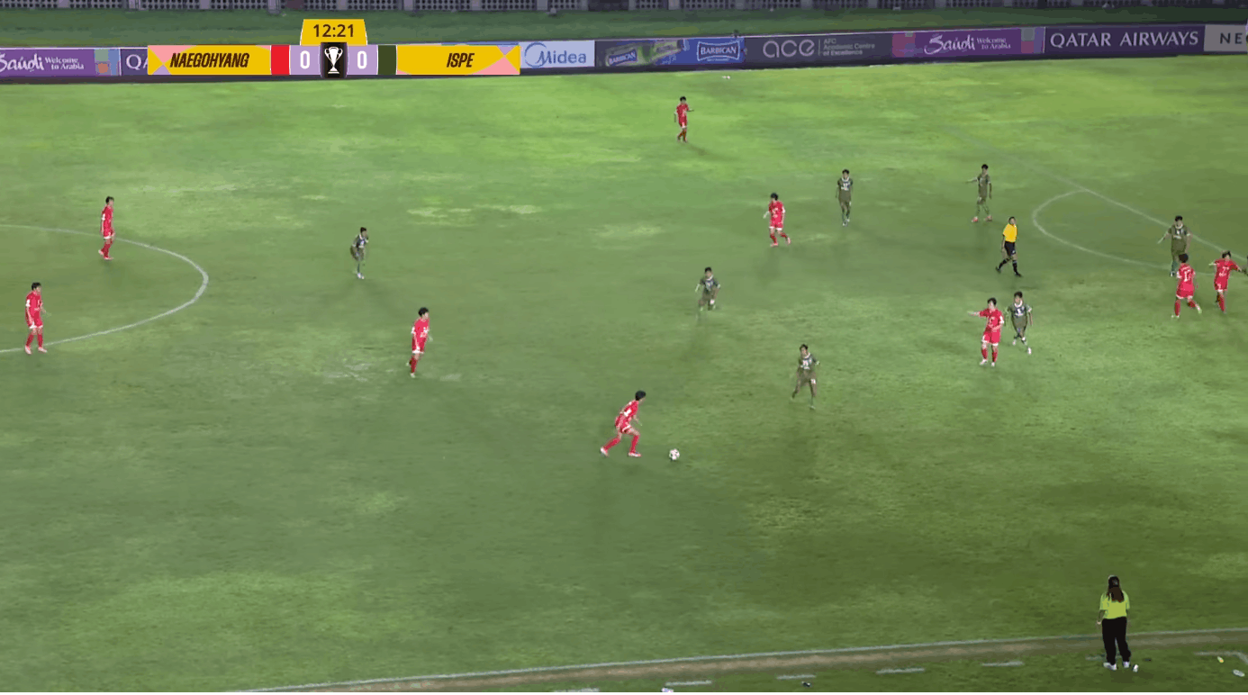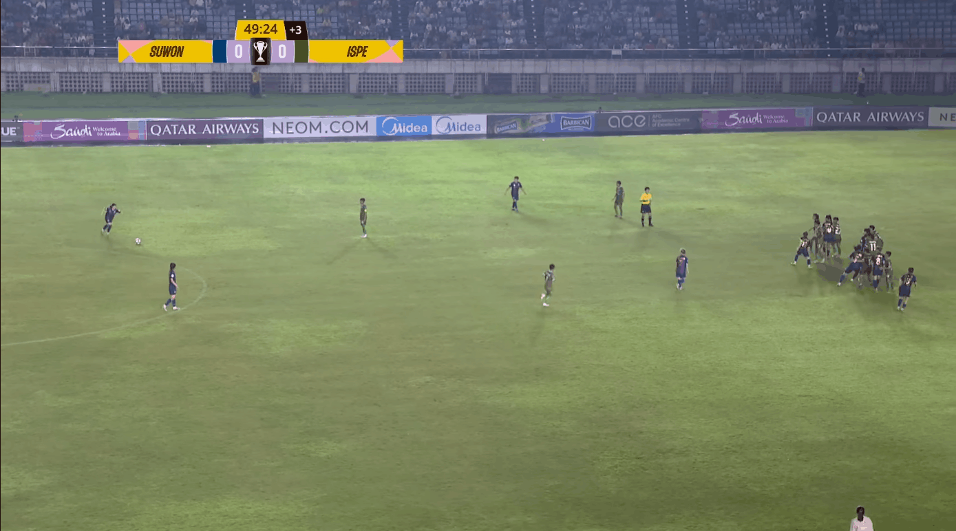 Overall, ISPE FC began the match with a very defensive approach. They kept a tight block of 9 defenders when Suwon had the ball and looked to quickly counter when they took possession. For their part, Suwon were willing to be patient in their attack, but they struggled to break through ISPE’s defensive lines, often settling to balls over the top that were collected by the keeper or shots from distance that were blocked by defenders.