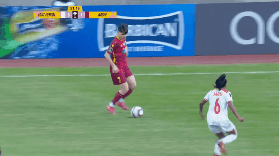 18’ After a series of attacks that were rebuffed by East Bengal’s defense, Nasaf quickly worked the ball left to right and sprung Nilufar Kudratova down the right. Behind the defense, Kudratova drove toward the line and centered for her attack partner, Diyorakhon Khabibullaeva, who easily finished. The goal was reviewed for a potential offside, and it is definitely close. But lacking the fancy line-drawing technology, I think awarding the goal was the appropriate call.