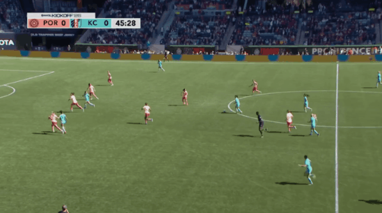 The Thorns players have more time on the ball when in possession. The runners have more space to run into and pass through. With planned patterns, you can suddenly play through the middle and get yourself running toward goal.