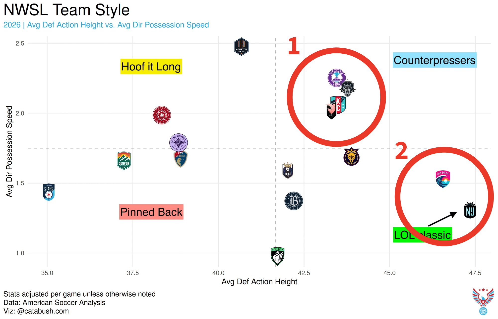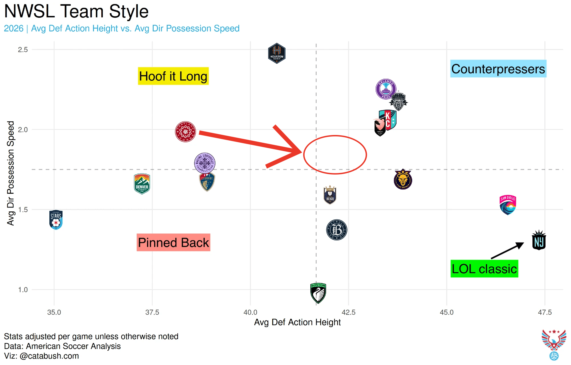 Fun with @catabush.com graphics at viz.americansocceranalysis.com! Here, we compare how high an #NWSL team usually makes a tackle/interception etc. with how quickly they move the ball up the field.