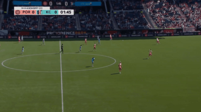 In the second minute, after the Thorns recycle possession back to the defender, Jayden Perry plays a long ball into space that Alidou or Vignola could attack.