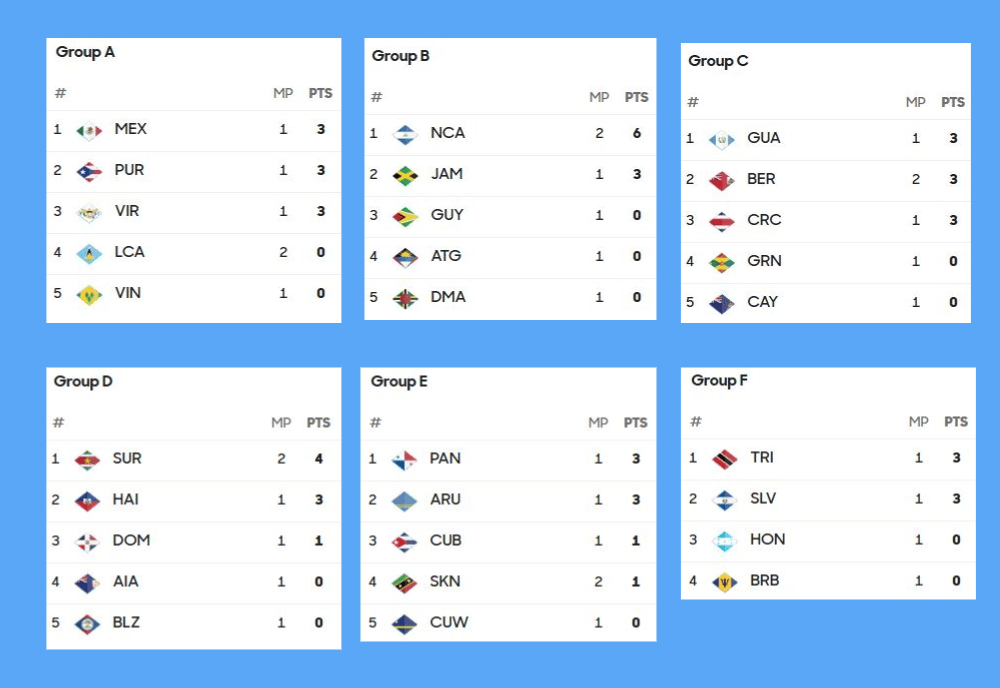 After the first set of matches, the standings in the qualifiers looks as follows. Only the group winners move on to the CONCACAF W Championship, which also serves as the next round of World Cup qualifying.